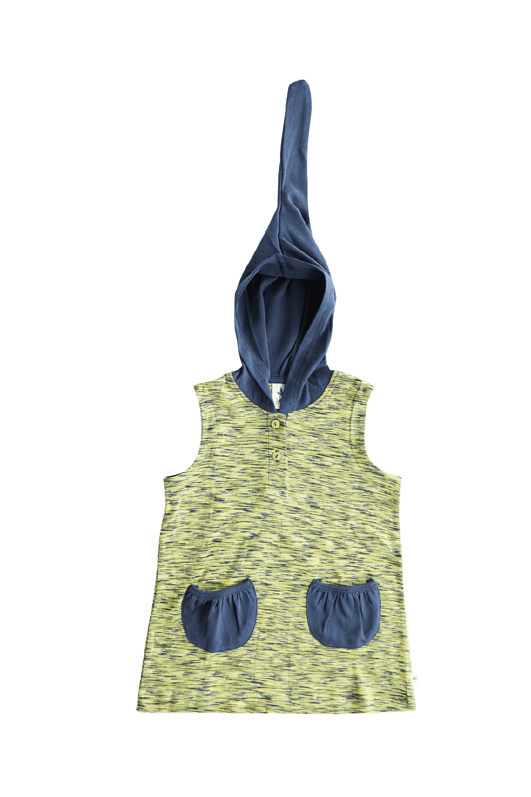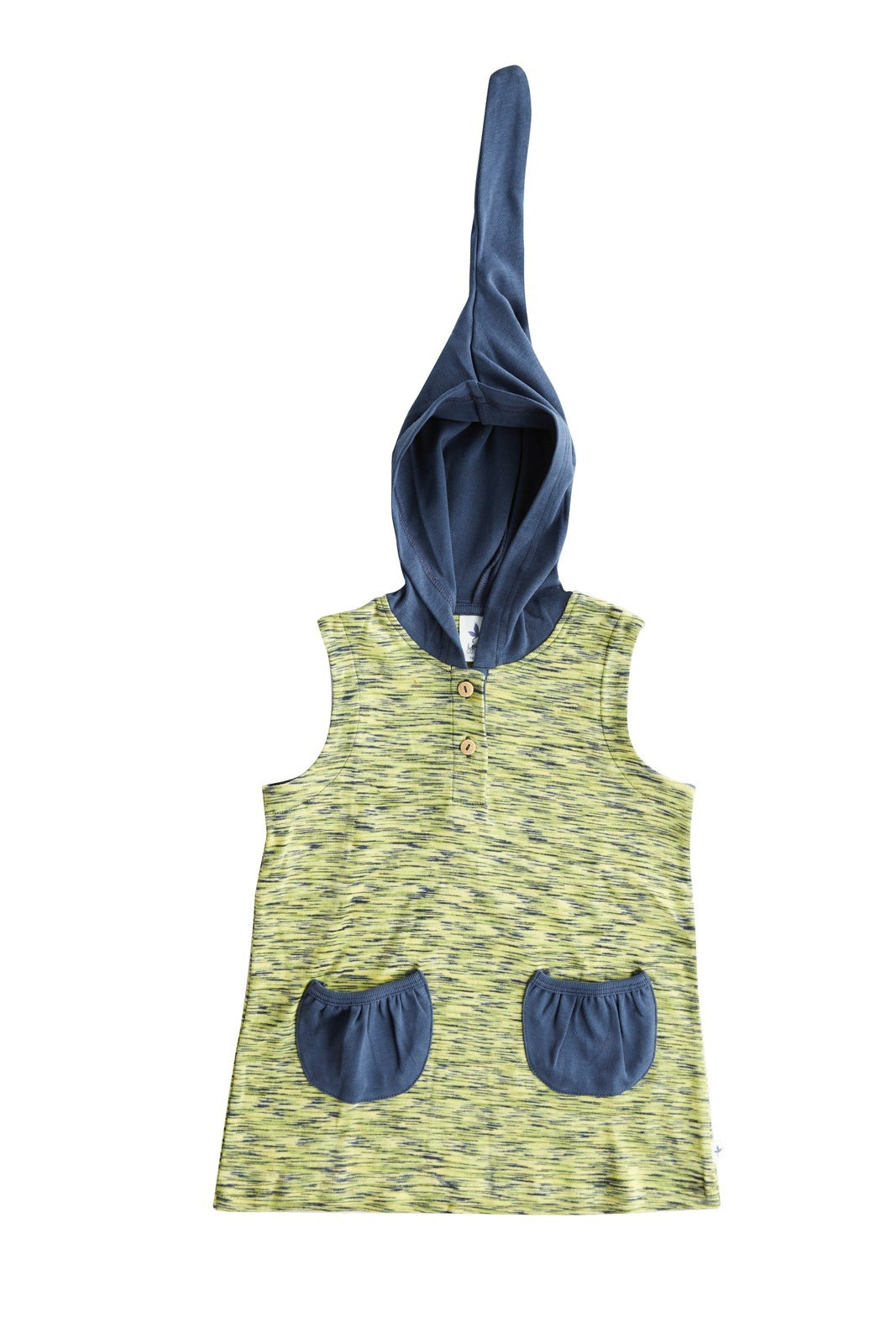 Kurzärmeliges Tunikakleid aus 100% Bio-Baumwolle (kbA) Rippjersey, in einer grün melierten Farbe die an eine "WIESE" erinnert. Die einfarbige Zipfelkapuze und zwei aufgesetzte Taschen sind die Details der Tunika. Besonders atmungsaktiv und angenehm zu tragen, mit vorderen Holzknöpfen, die das Ankleiden erleichtern.