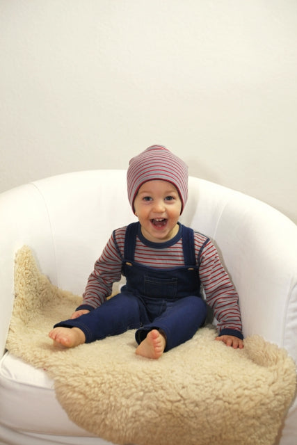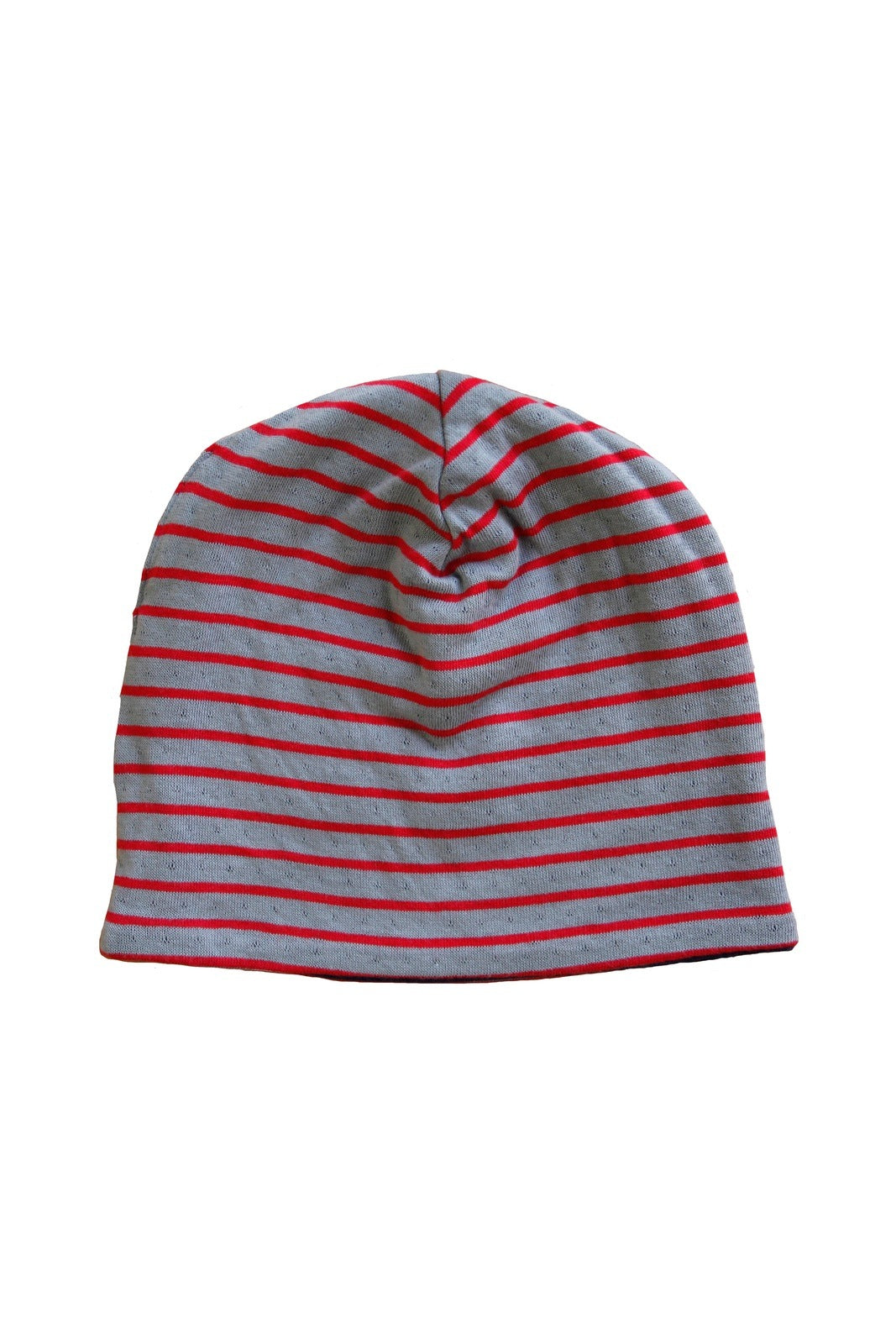 Eine Mütze - zwei Looks. Eine Mütze aus tollem doppelseitigem Interlockstoff, 100 % Bio-Baumwolle, in einem tiefen Dunkelblau mit beige-melange Punkten. Und die andere Seite gestreift in beige-melange und tomatenrot. Kopfumfang: 44 cm, 46 cm