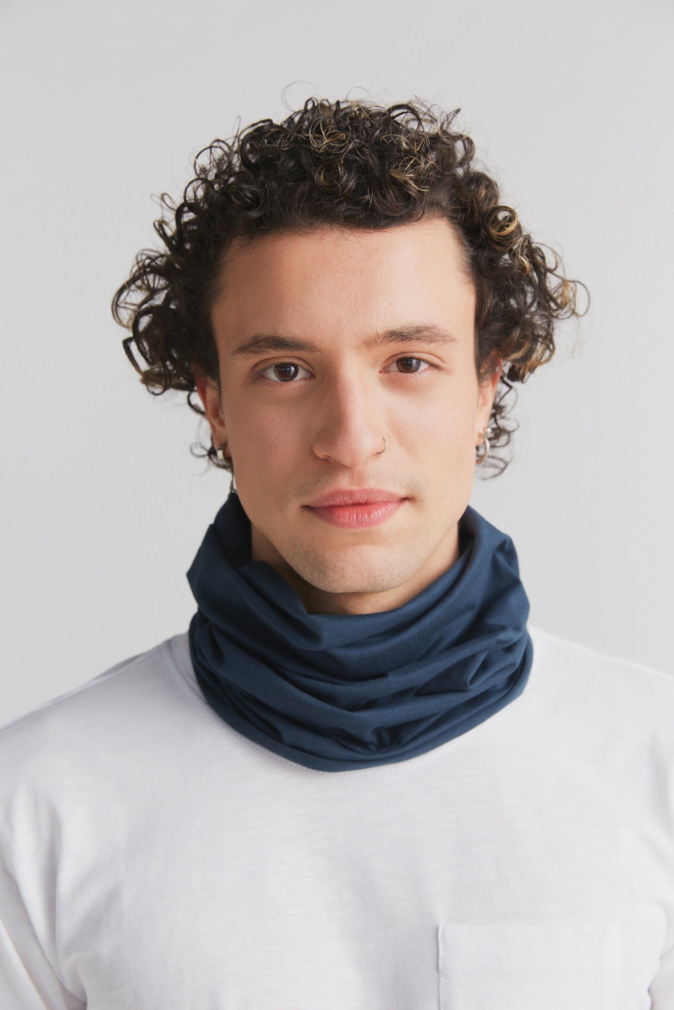 Weicher Schlauchschal in einem geometrischen Muster in Naturweiß und Schwarz aus 95% Bio-Baumwolle (kbA) und 5% Elasthan. Größe One Size. Fair & nachhaltig hergestellt in der Türkei und Ägypten – mit türkischer Bio-Baumwolle aus kontrolliert ökologischem Anbau.