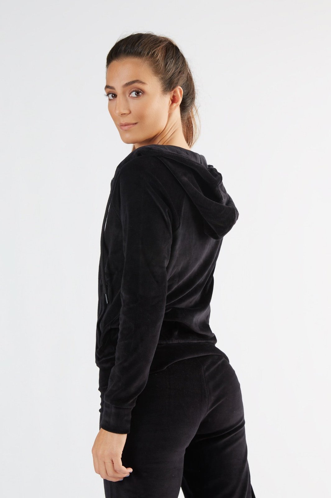 Kuschelige Kapuzenjacke aus Nicky, 100 % Bio-Baumwolle (kbA), die sehr angenehm auf der Haut ist. In einer tollen schwarzen Samtoptik. Kombiniert mit einem nickelfreien Reißverschluss, Seitentaschen sowie einer Kapuze mit Kordeldurchzug. Gemütlicher Schnitt für einen optimalen Tragekomfort.