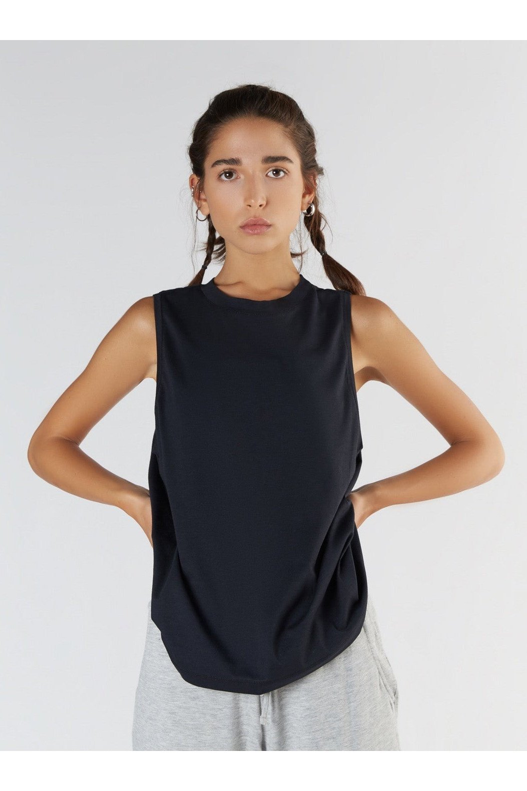 Hochwertiges Top aus 58% Bio-Baumwolle (kbA), 39% TENCEL™ Modal und 3% Elasthan. Die Bio-Baumwolle wird ohne schädliche Chemikalien angebaut und ist besonders hautfreundlich. TENCEL™ Modal, aus nachhaltig gewonnenem Buchenholz, sorgt für eine außergewöhnlich weiche und glatte Textur. Das locker geschnittene Top mit hohem Rundhalsausschnitt und weiten Armausschnitten bietet Bewegungsfreiheit und Komfort. Die weiche, elastische Baumwollmischung mit feuchtigkeitsregulierender Funktion ist optimal für sportliche Aktivitäten und ebenso gut für den Alltag geeignet.