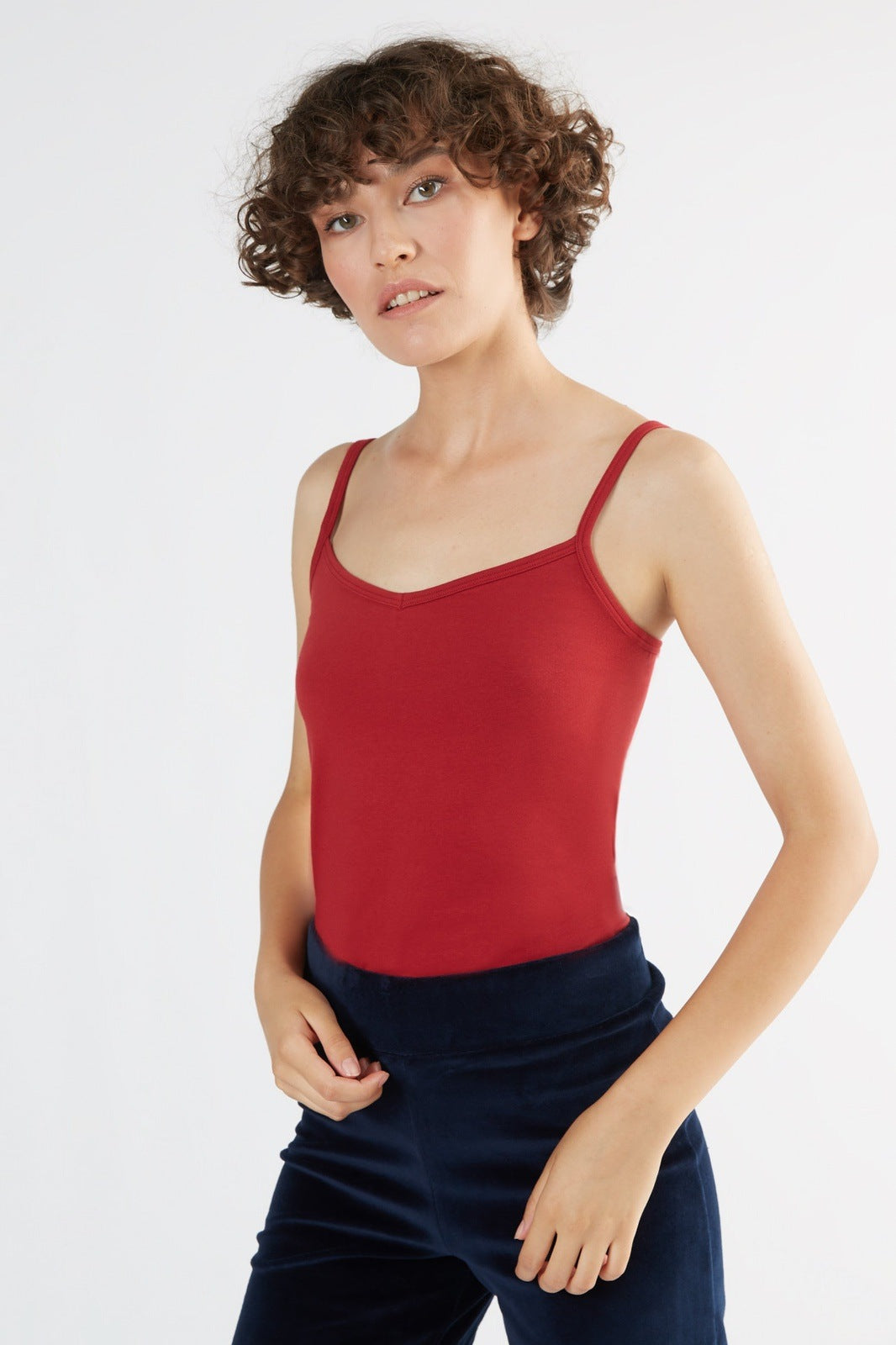 Rotes Spaghettiträger-Top. Die hochwertige Qualität ist angehem auf der Haut und verleiht einen tollen Tragekomfort. Kürzere Passform aus weichem Baumwolljersey, 95 % Bio-Baumwolle (kbA) und 5% Elasthan. Gr. S, M, L, XL
