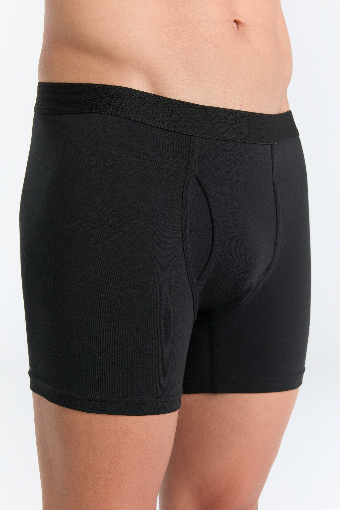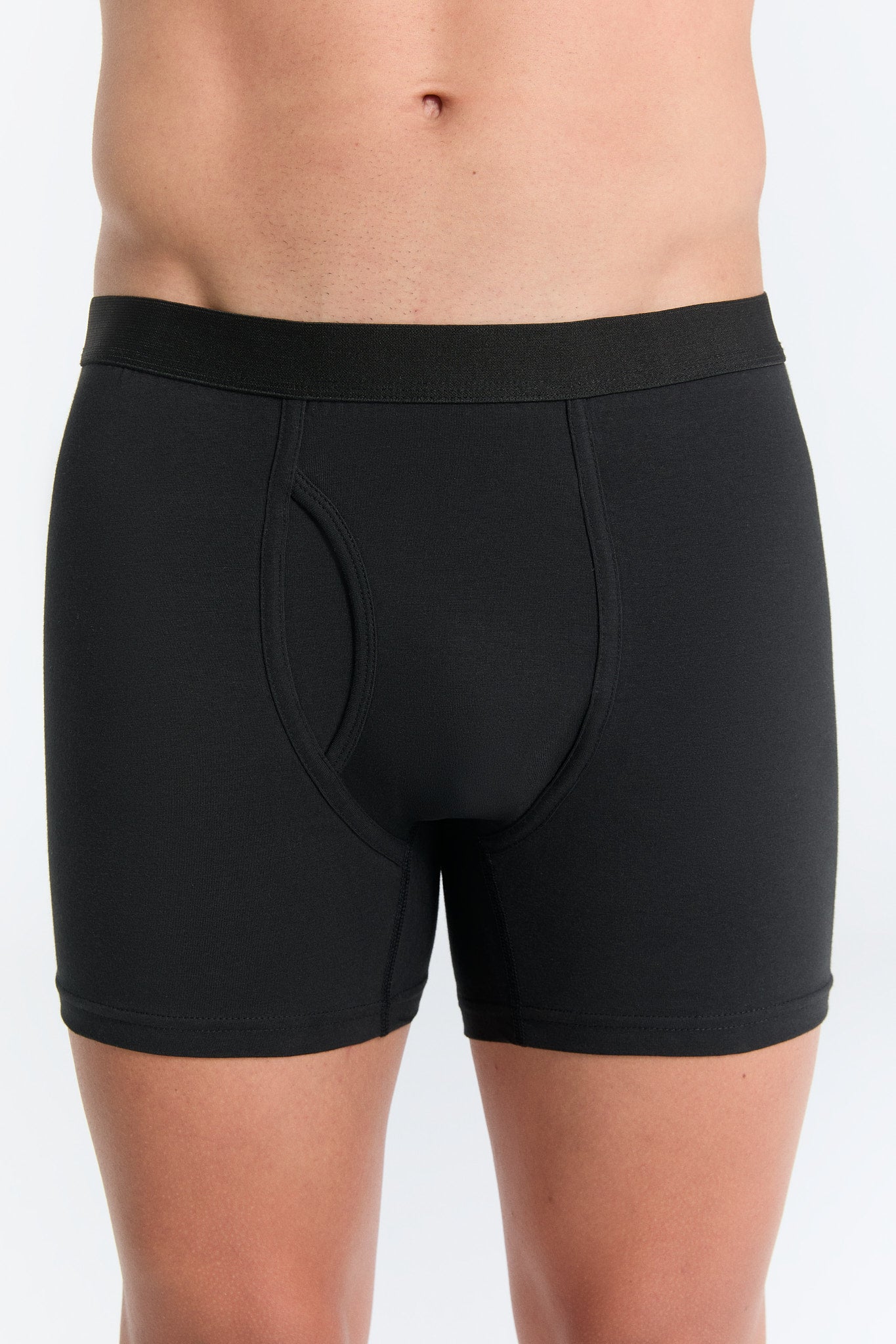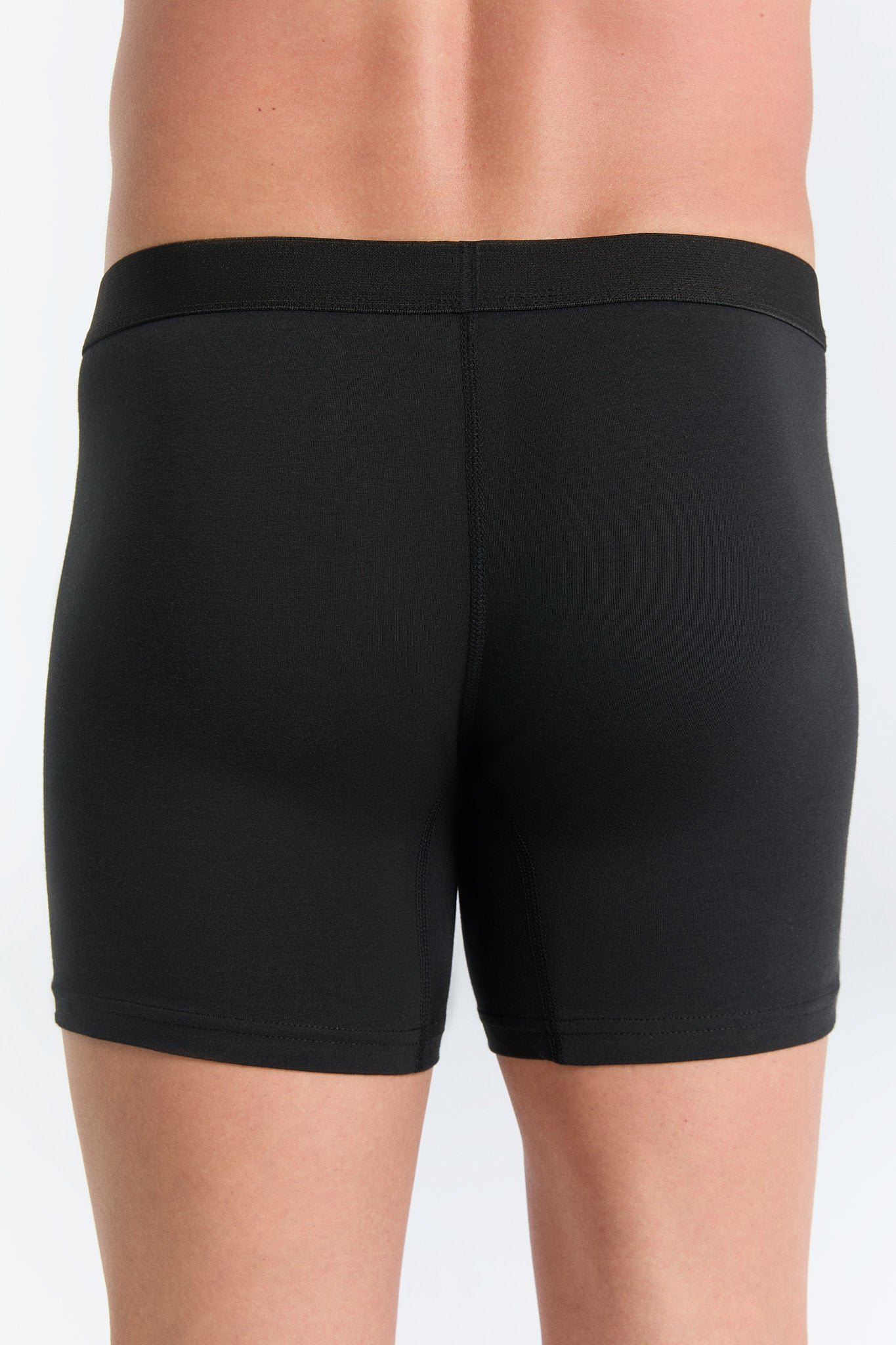 Herren Boxershorts in Schwarz mit elastischem, schwarzen Taillenbund in einem sportlich, trendigen Design mit Eingriff aus 95% Bio-Baumwolljersey (kbA) und 5% Elasthan. Die enge Passform aus weichem Baumwolljersey hat eine hohe Qualität, ist angenehm auf der Haut und verleiht dir ein optimales Traggefühl. Fair & nachhaltig hergestellt in der Türkei und Ägypten – mit türkischer Bio-Baumwolle aus kontrolliert ökologischem Anbau.
