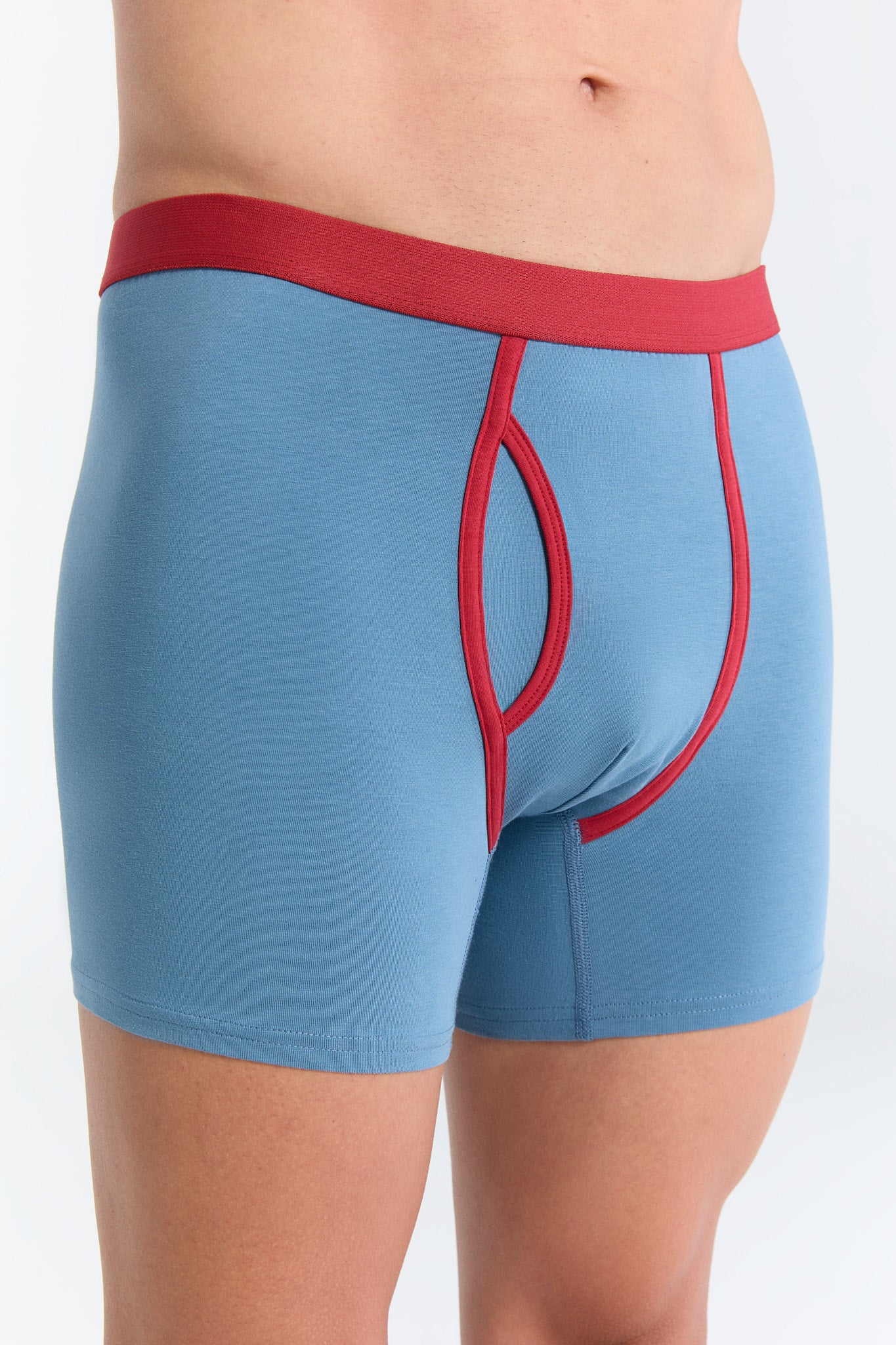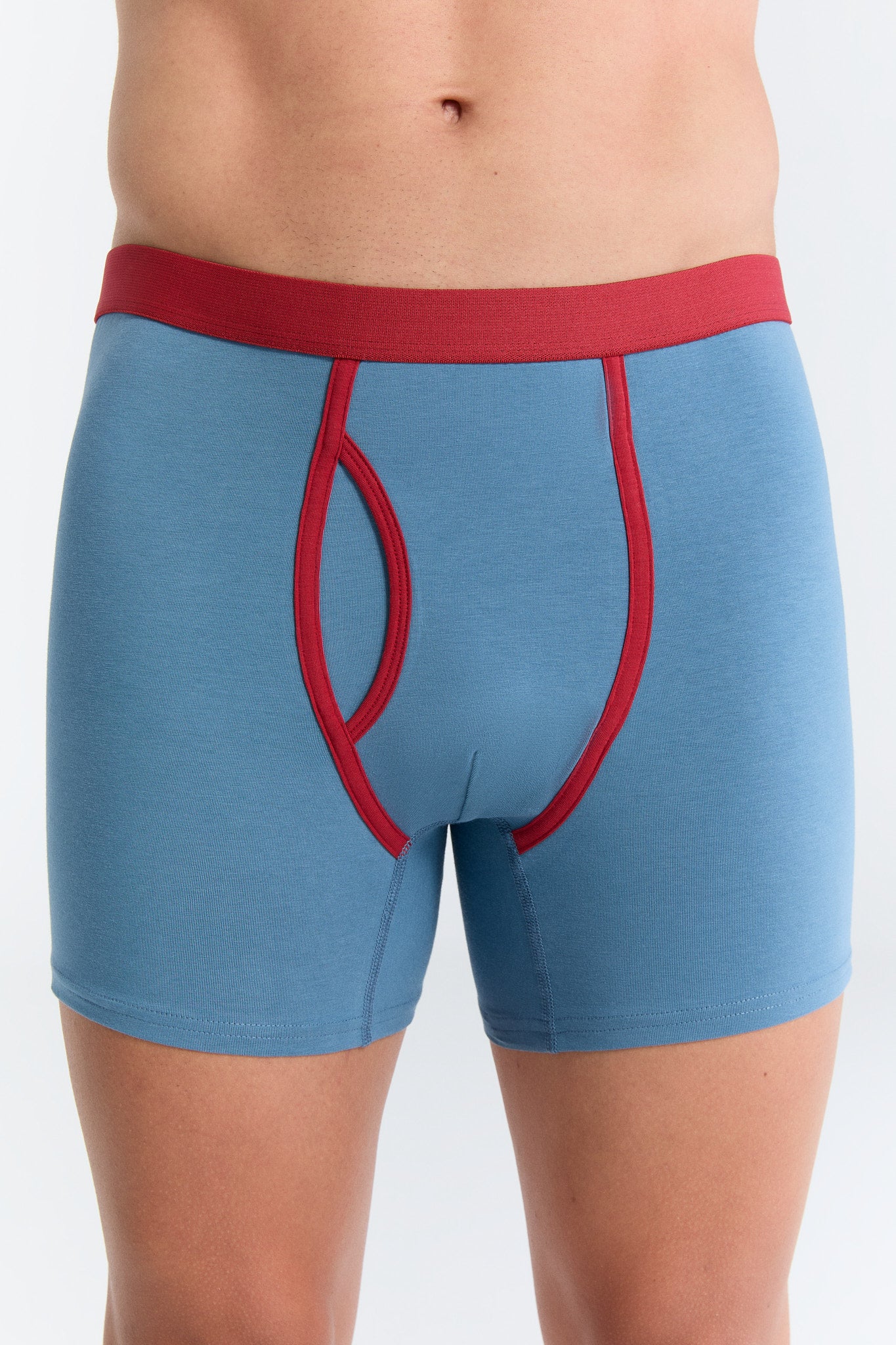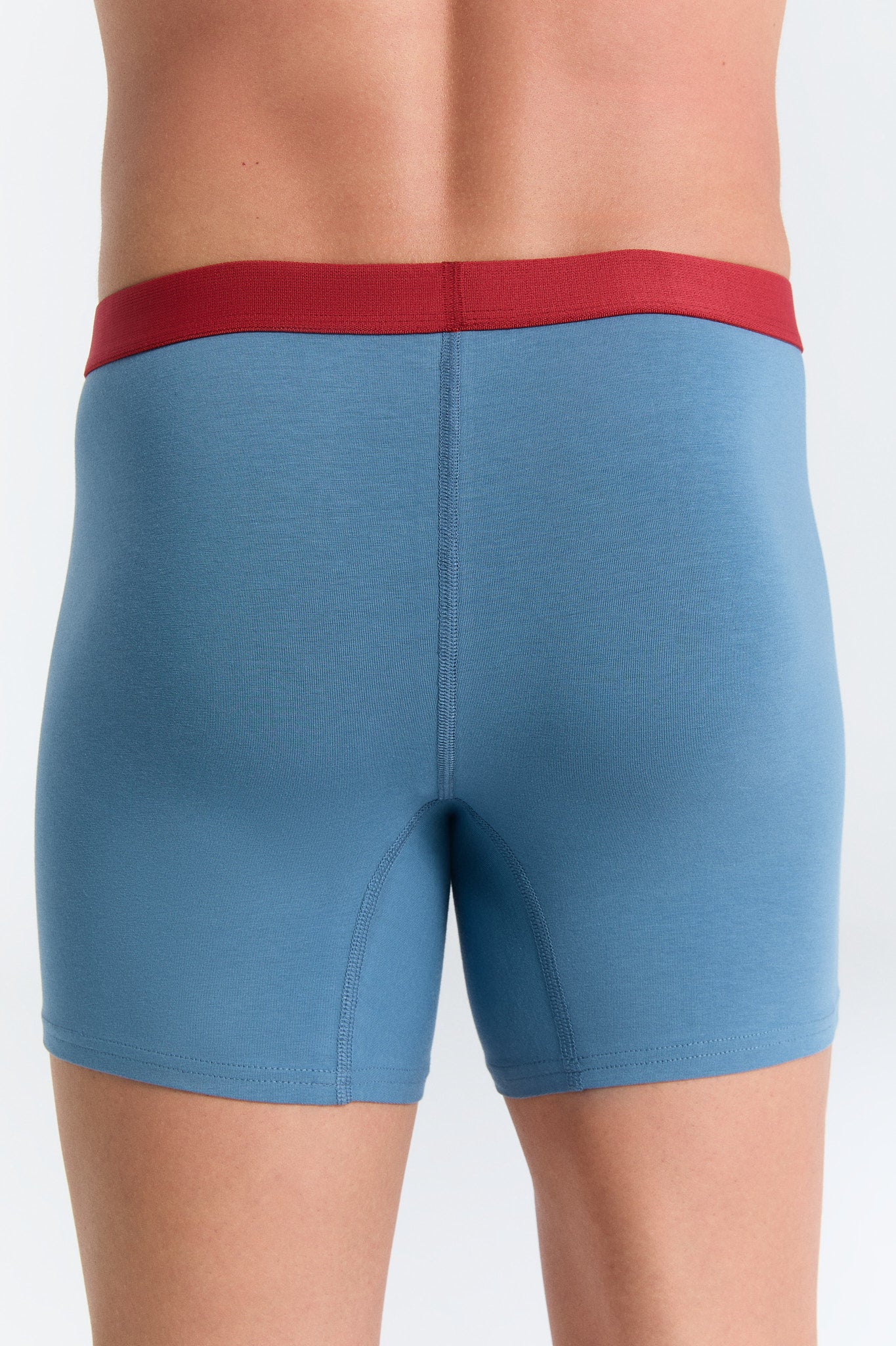 - Boxer shorts in denim blue with elastic waistband and contrasting seems in red