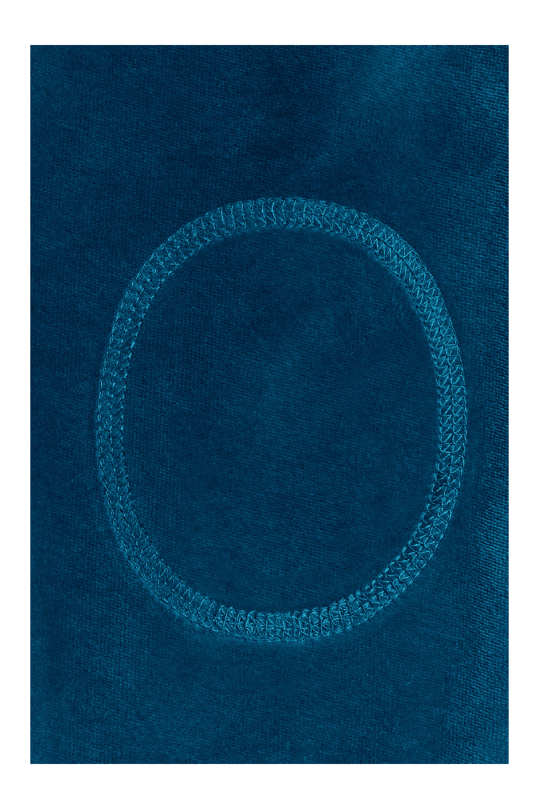 Cozy velor pants made of 100% organic cotton (kbA) in a deep ocean blue, combined with light gray striped jersey, with ocean blue and moss green stripes on the extra long ankle cuffs and side pockets. The look is rounded off with knee patches.