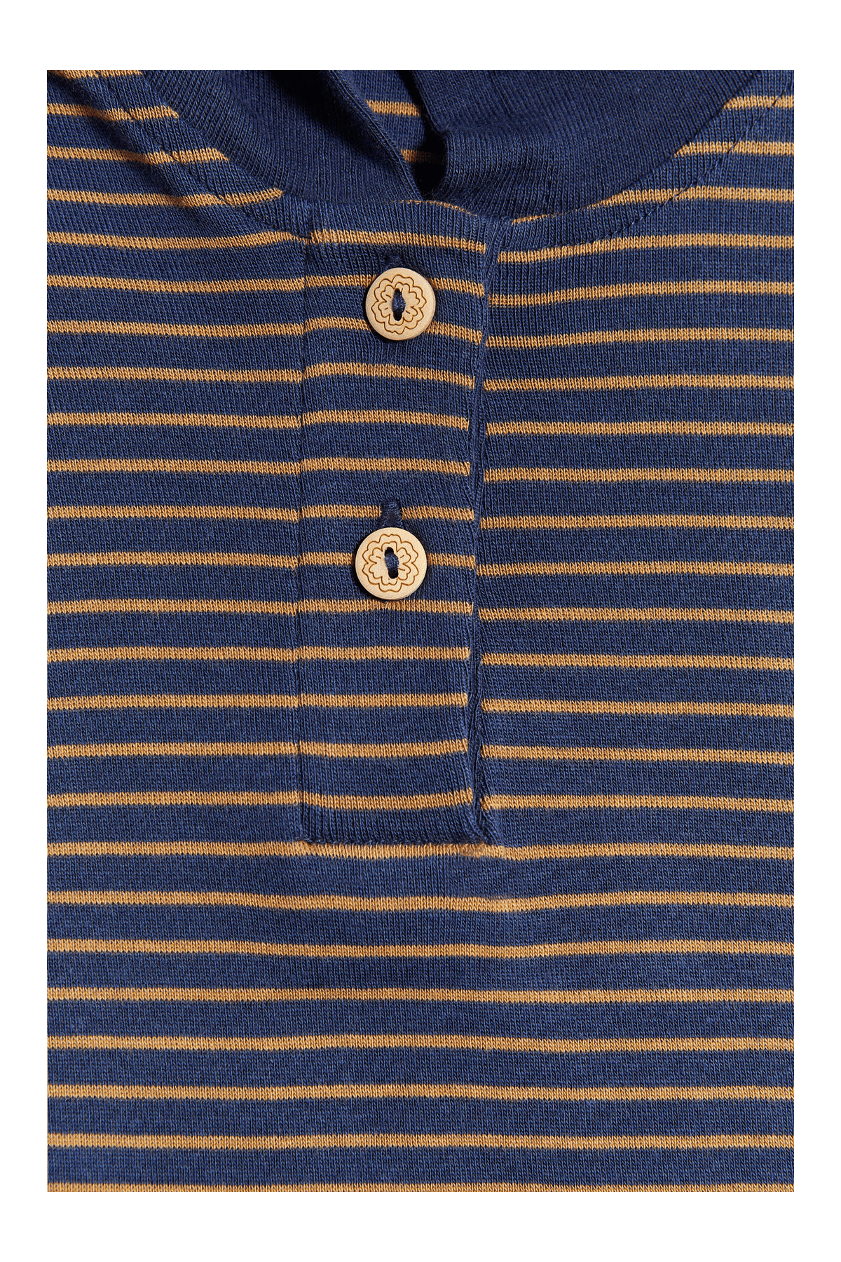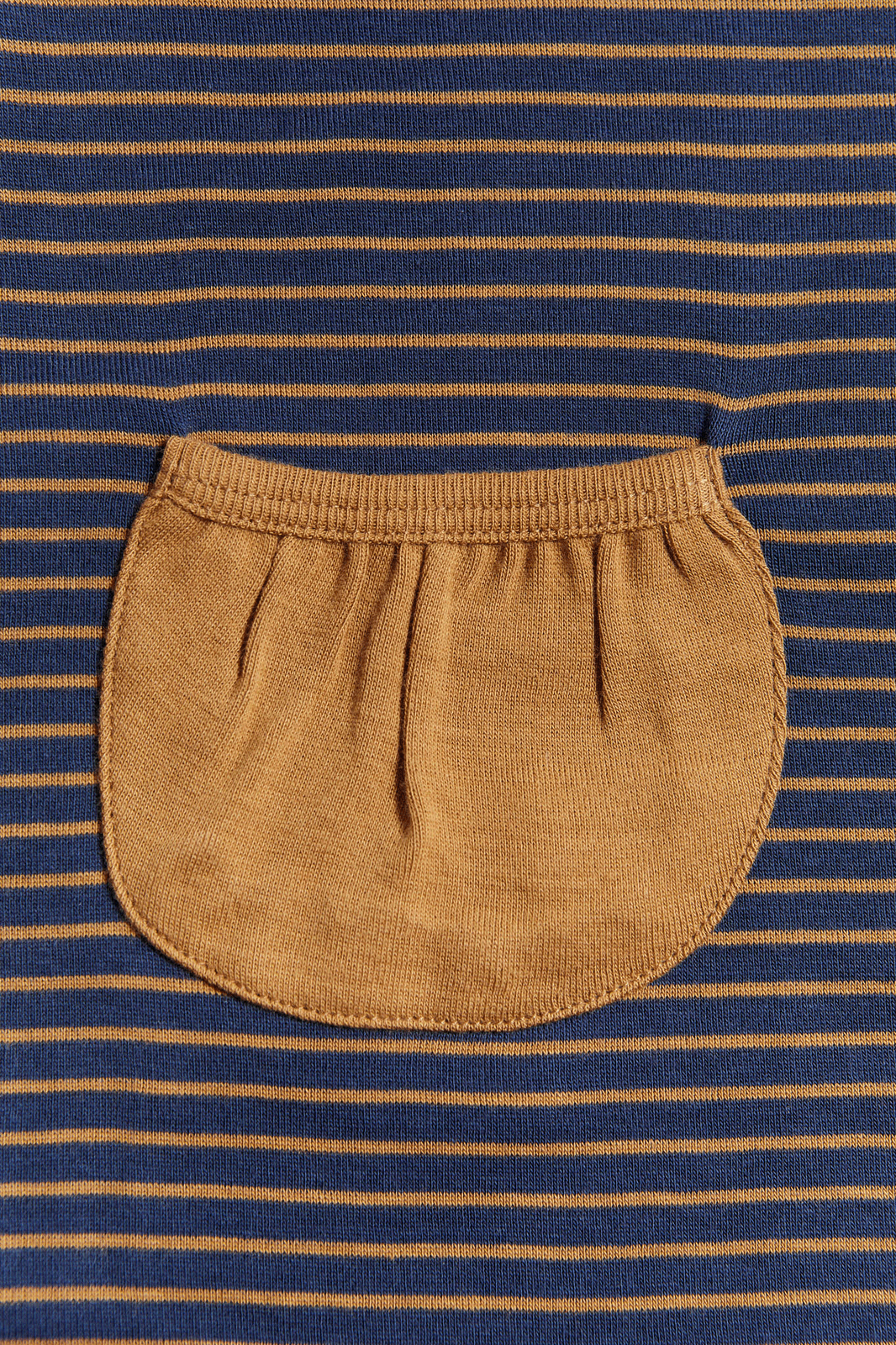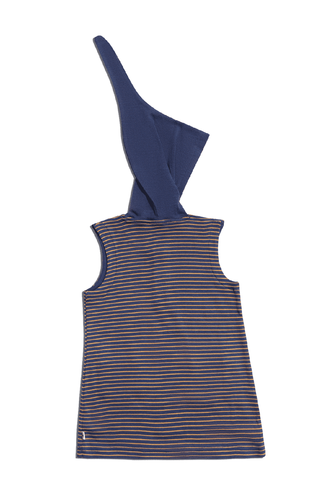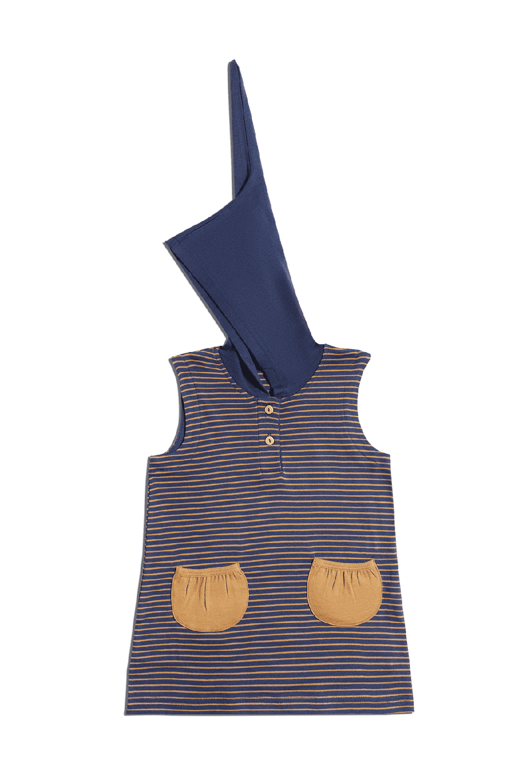 Short-sleeved tunic dress made of 100% organic cotton (kbA) rib jersey, in a midnight indigo with ginger-colored pinstripes. The single-colored pointed hood and two patch pockets in ginger are the details of the tunic. Particularly breathable and comfortable to wear, with front wooden buttons that make dressing easier.