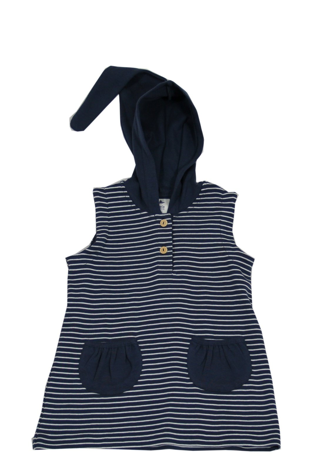 Short-sleeved tunic dress made from 100% organic cotton (kbA) rib jersey, in a midnight indigo with white pinstripes. The single-colored pointed hood and two patch pockets in indigo are the details of the tunic. Particularly breathable and comfortable to wear with front wooden buttons that make dressing easier.