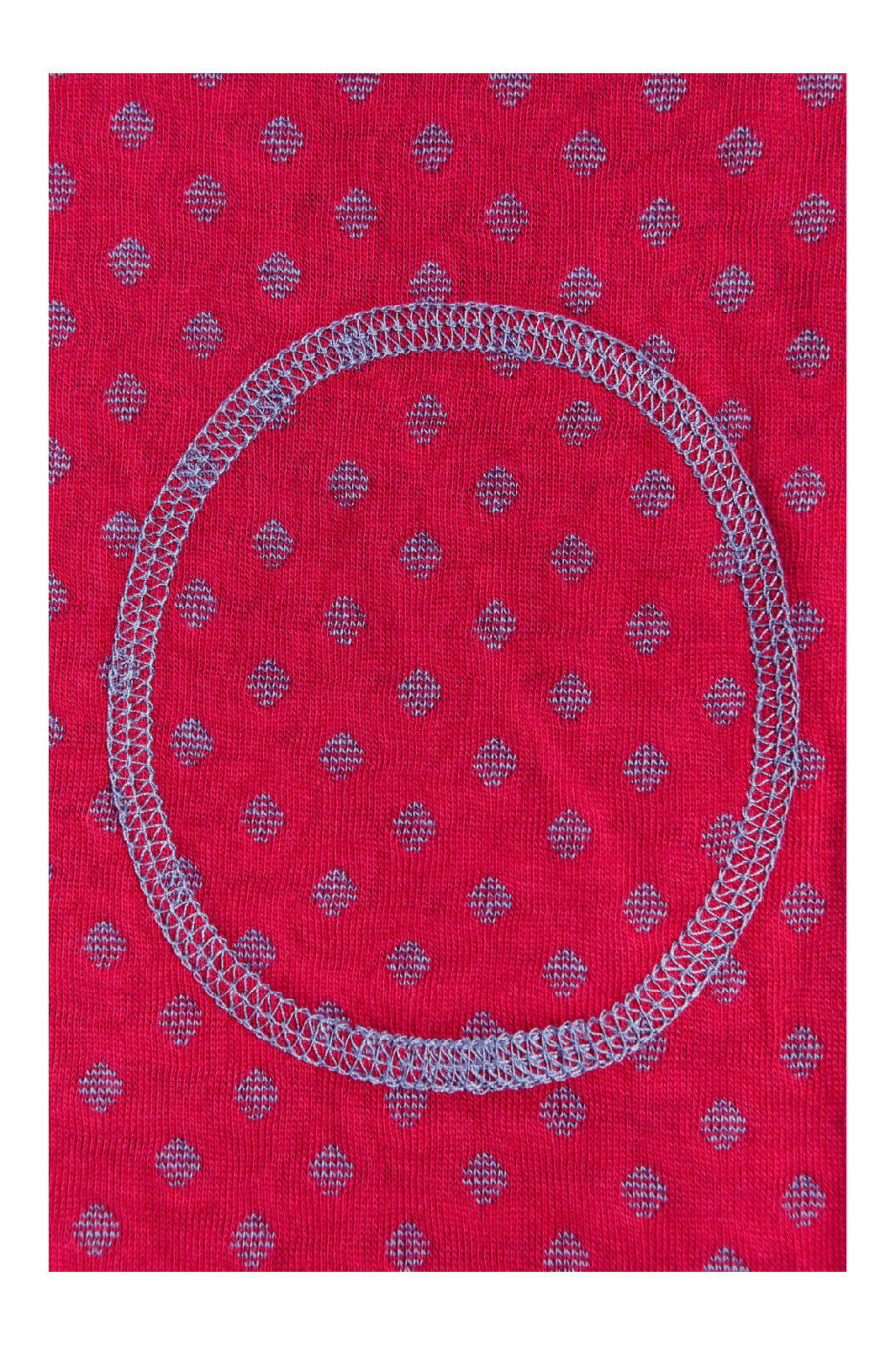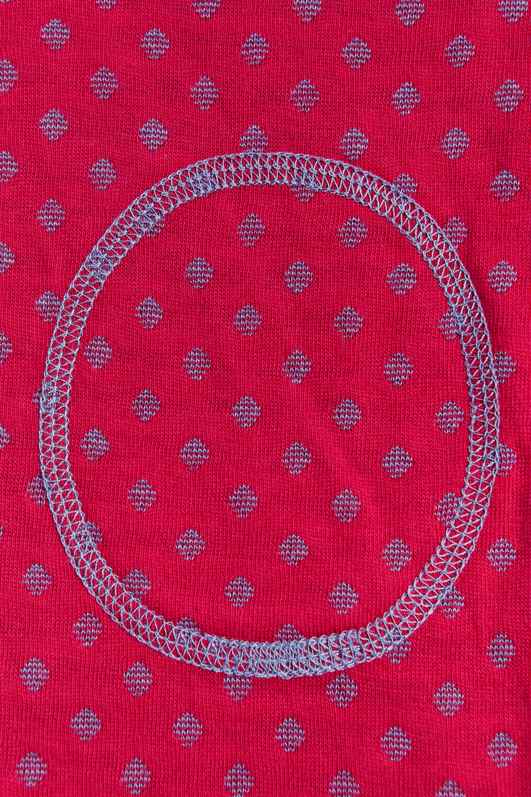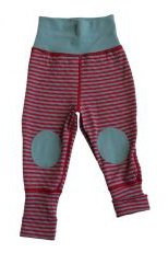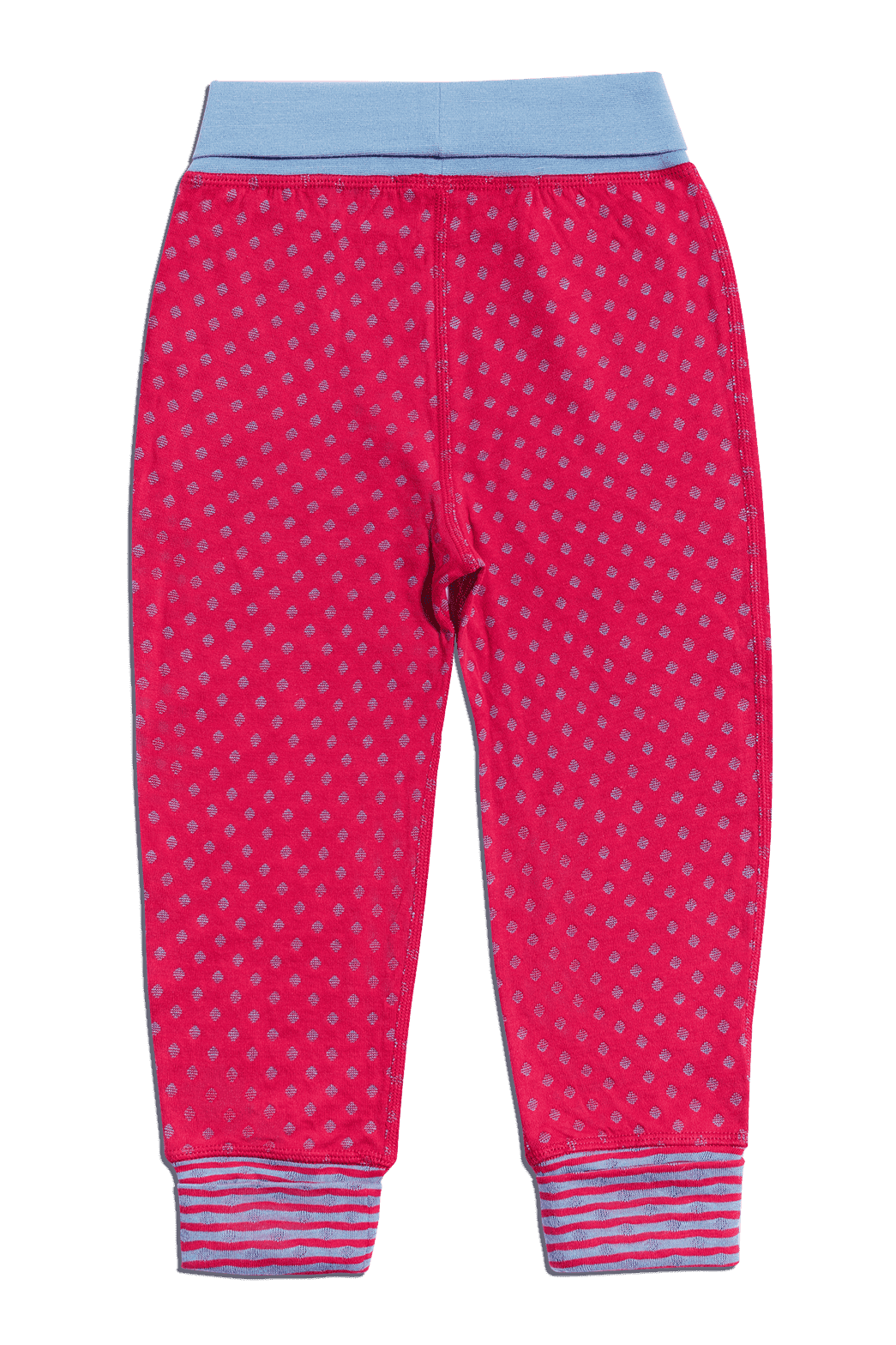 One pant - two looks. Double-sided interlook fabric made from 100% organic cotton (kbA) in a strong Persian red and pigeon blue. Striped on one side and polka dots on the other side, combined with knee patches. The wide navel waistband and ankle waistband allow the pants to grow with you. Particularly breathable and comfortable to wear.