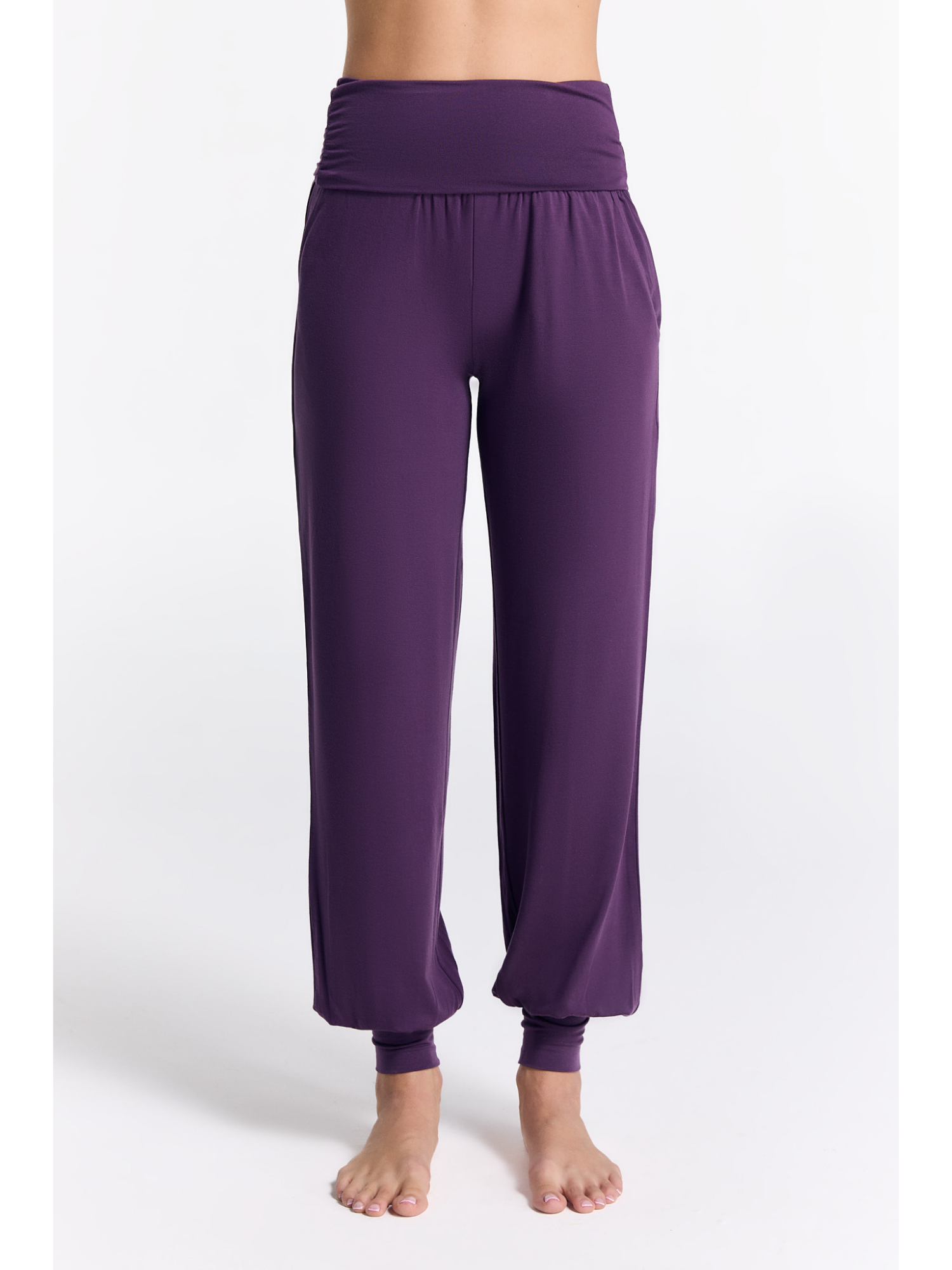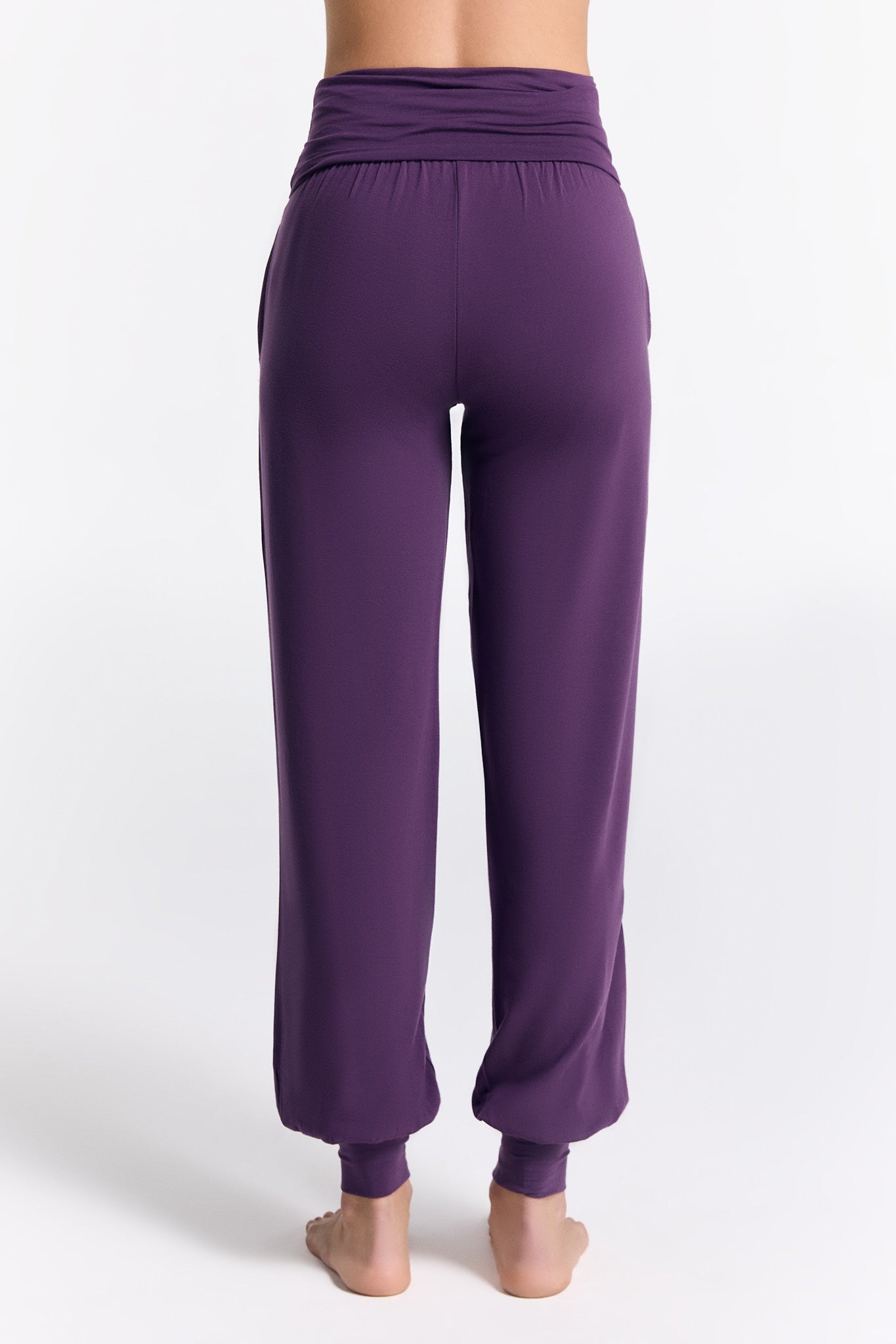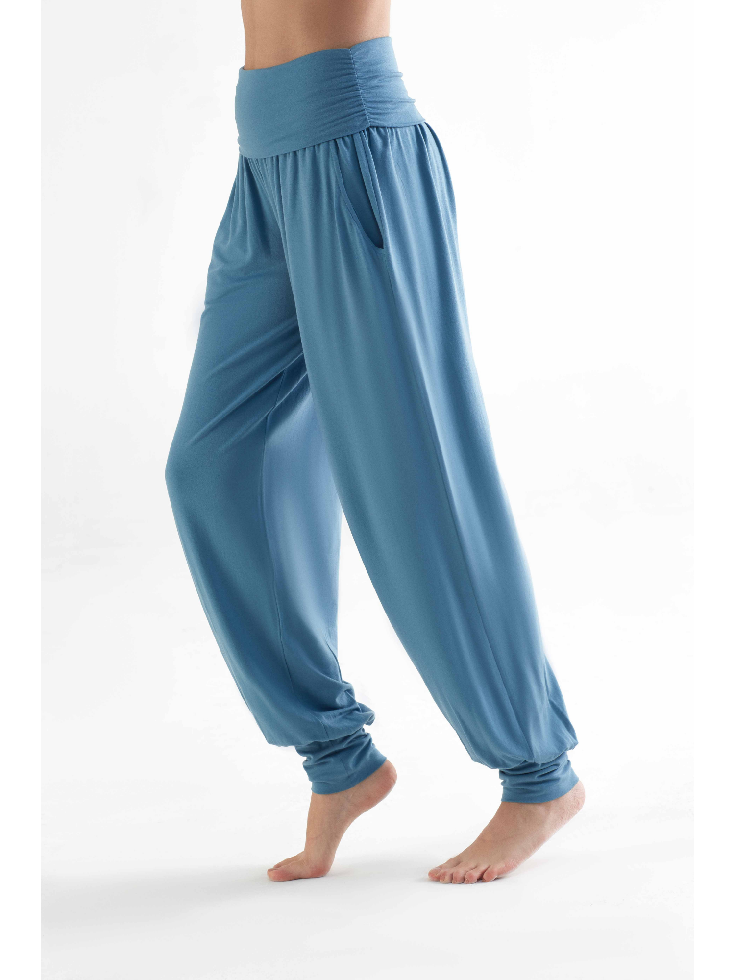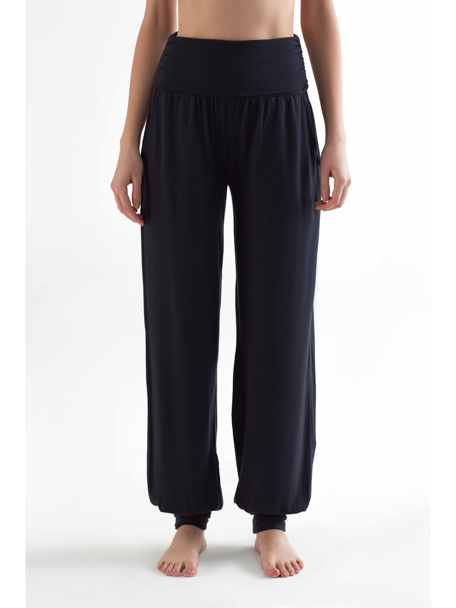 High-quality yoga pants made from 95% TENCEL™ Lyocell and 5% elastane. These yoga pants have a loose, flowing fit with two front pockets. The ankle cuffs and wide fold-over waistband at the stomach enhance comfort. The soft, stretchy fabric is highly durable and provides excellent freedom of movement. TENCEL™ Lyocell is made from regenerated cellulose fibers, known for their natural comfort and environmentally friendly, closed-loop production process. These fibers offer high strength, a gentle feel on the skin, and excellent moisture regulation, making these pants perfect for sports activities as well as leisure wear.