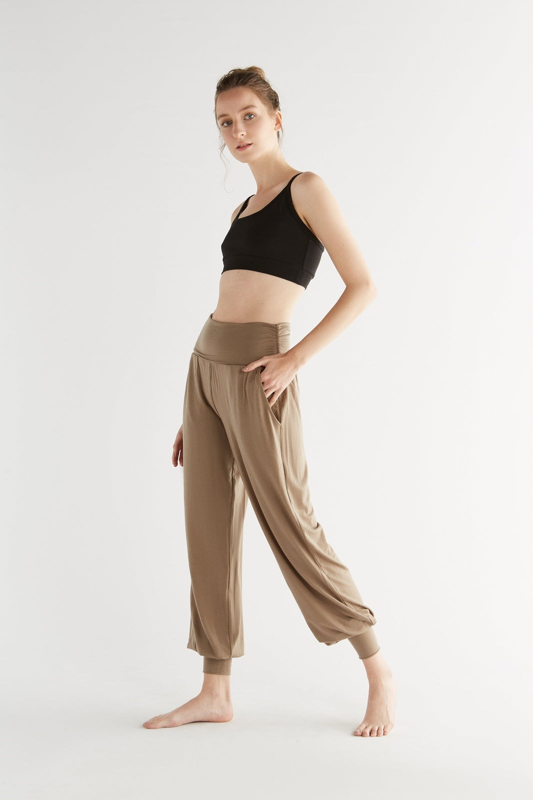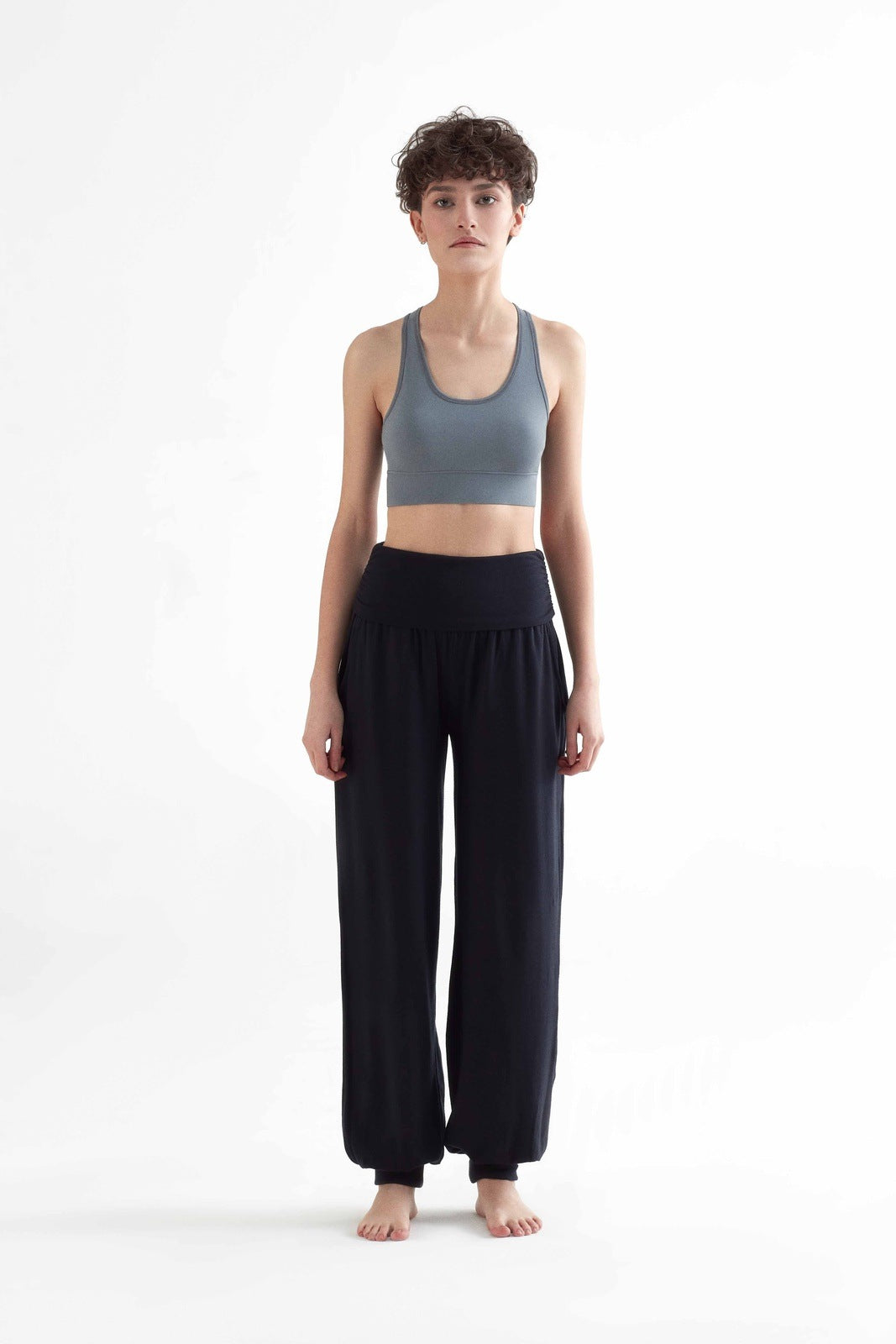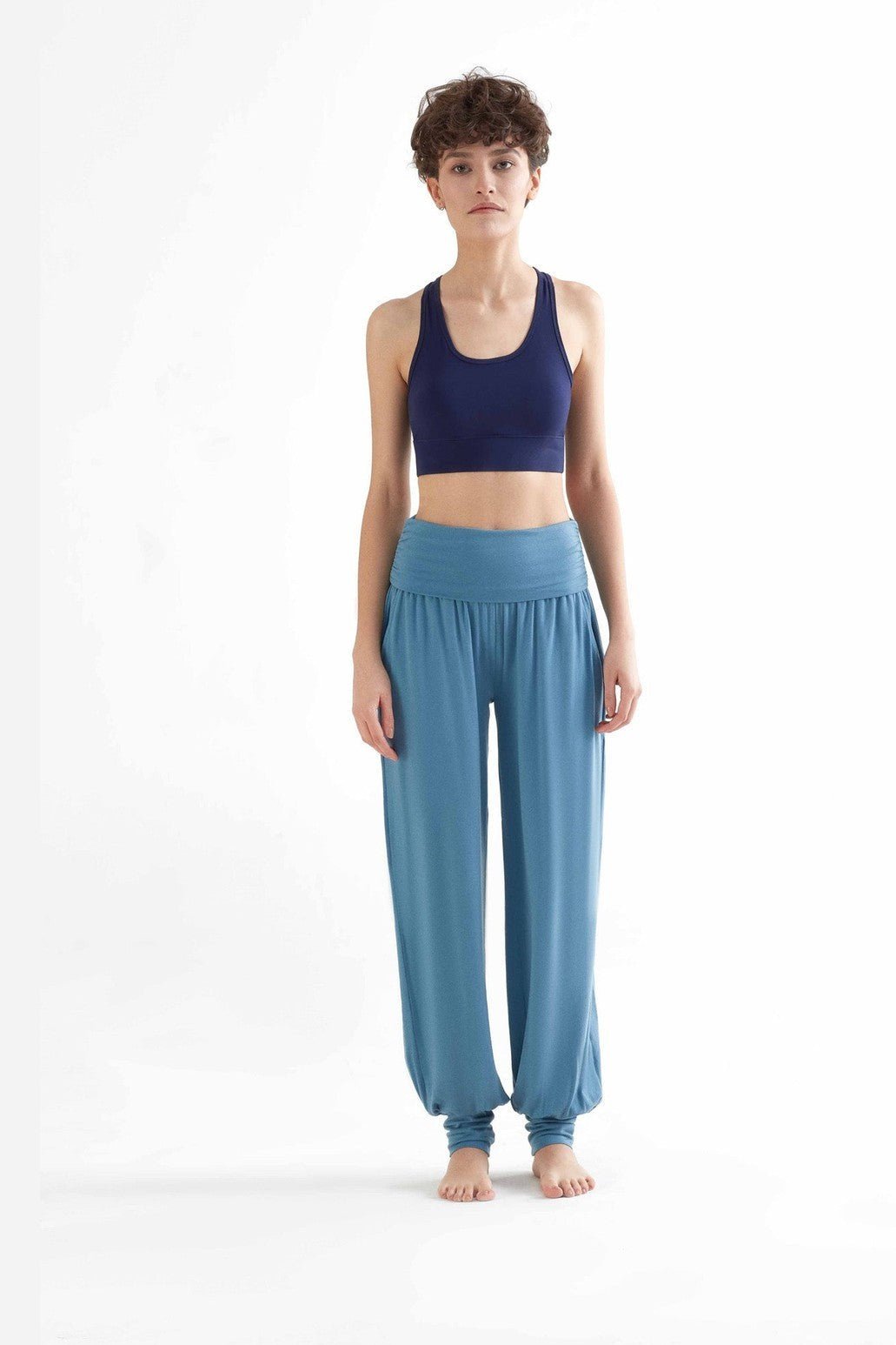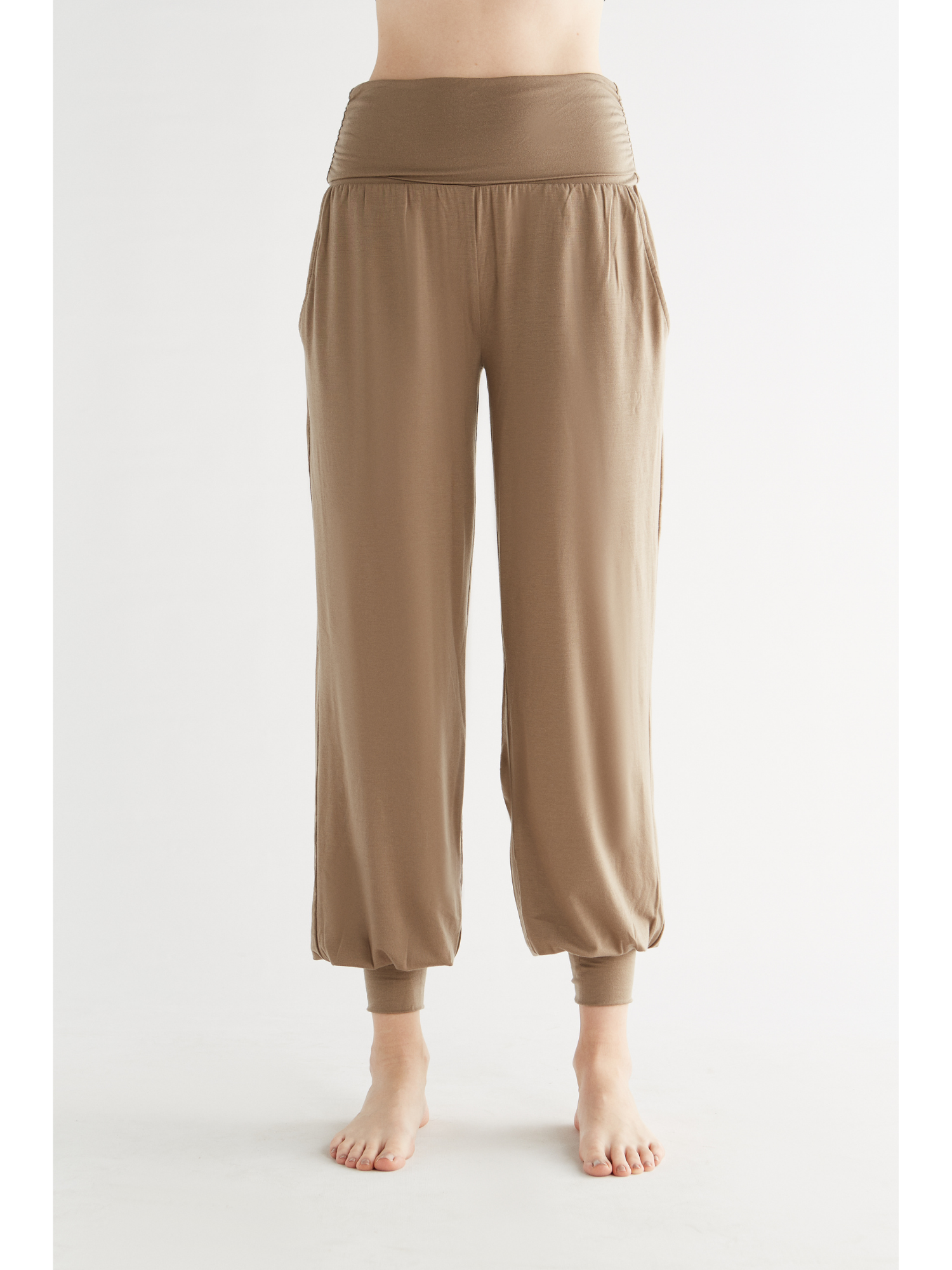 High-quality yoga pants made from 95% TENCEL™ Lyocell and 5% elastane. These yoga pants have a loose, flowing fit with two front pockets. The ankle cuffs and wide fold-over waistband at the stomach enhance comfort. The soft, stretchy fabric is highly durable and provides excellent freedom of movement. TENCEL™ Lyocell is made from regenerated cellulose fibers, known for their natural comfort and environmentally friendly, closed-loop production process. These fibers offer high strength, a gentle feel on the skin, and excellent moisture regulation, making these pants perfect for sports activities as well as leisure wear.