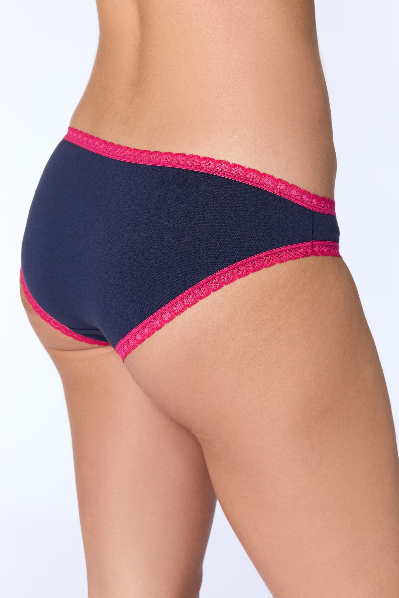 Ladies' panties in dark blue, with soft, elastic pink lace on the waistband and on the leg ends. The high-quality, soft cotton jersey is pleasant on the skin and makes it comfortable to wear. Classic fit made from 95% organic cotton (kbA) and 5% elastane.