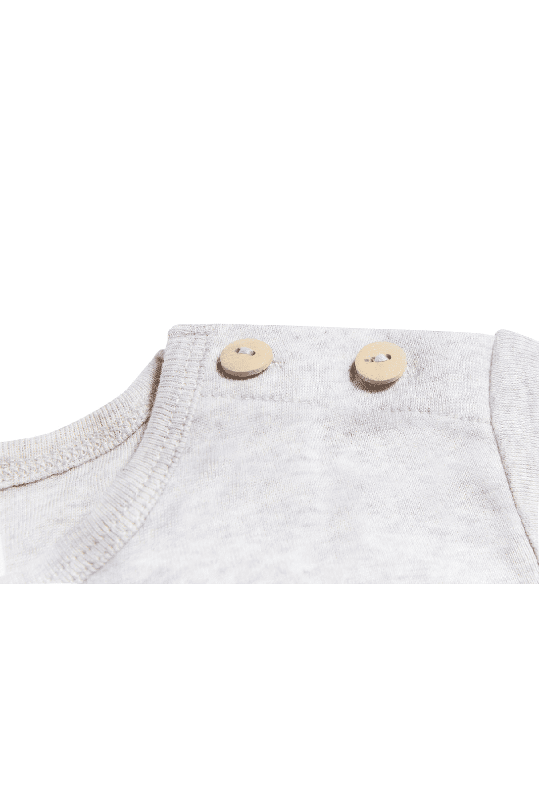 High-quality rib jersey short-sleeved shirt made from 100% organic cotton (kbA) in a conventional gray with a melange texture. Particularly breathable and comfortable to wear. With wooden buttons on the left shoulder in size 98/104 to make dressing easier.