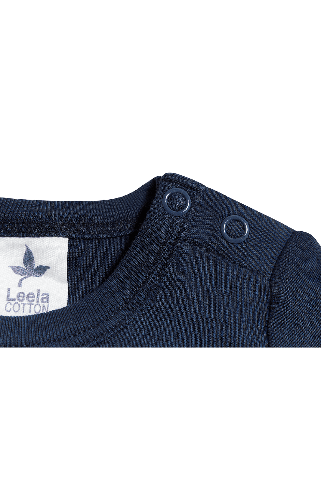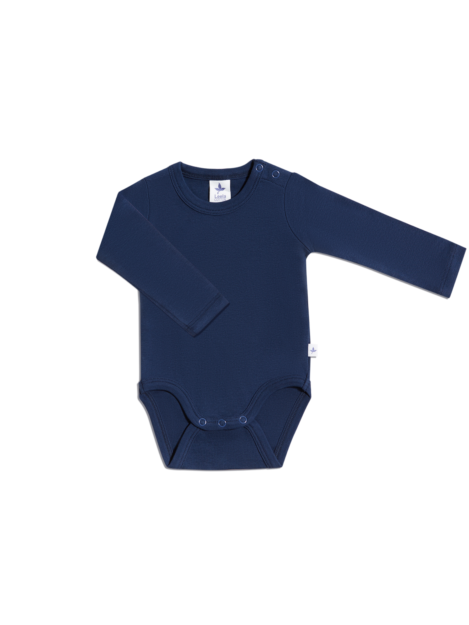 Hochwertiger Rippjersey Langarmbody aus 100% Bio-Baumwolle (kbA) in einem mitternachts Indigo. Besonders atmungsaktiv und angenehm zu tragen mit, nickelfreien Druckknopf an der Schulter und im Schritt.
