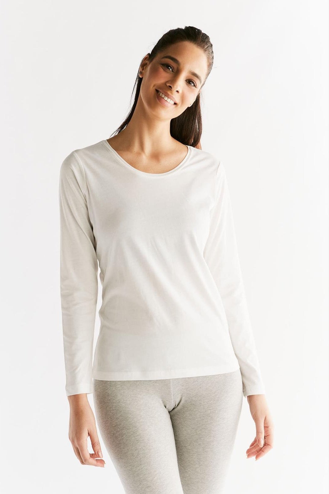 Naturweißes Damen Langarmshirt. Wird gerne als Top oder Unterhemd getragen. Die hochwertige Qualität aus weichem Baumwolljersey ist angehem auf der Haut und verleiht einen tollen Tragekomfort. Klassische Passform mit Rundhalsausschnitt aus 100% Bio-Baumwolle (kbA). Gr. S, M, L, XL