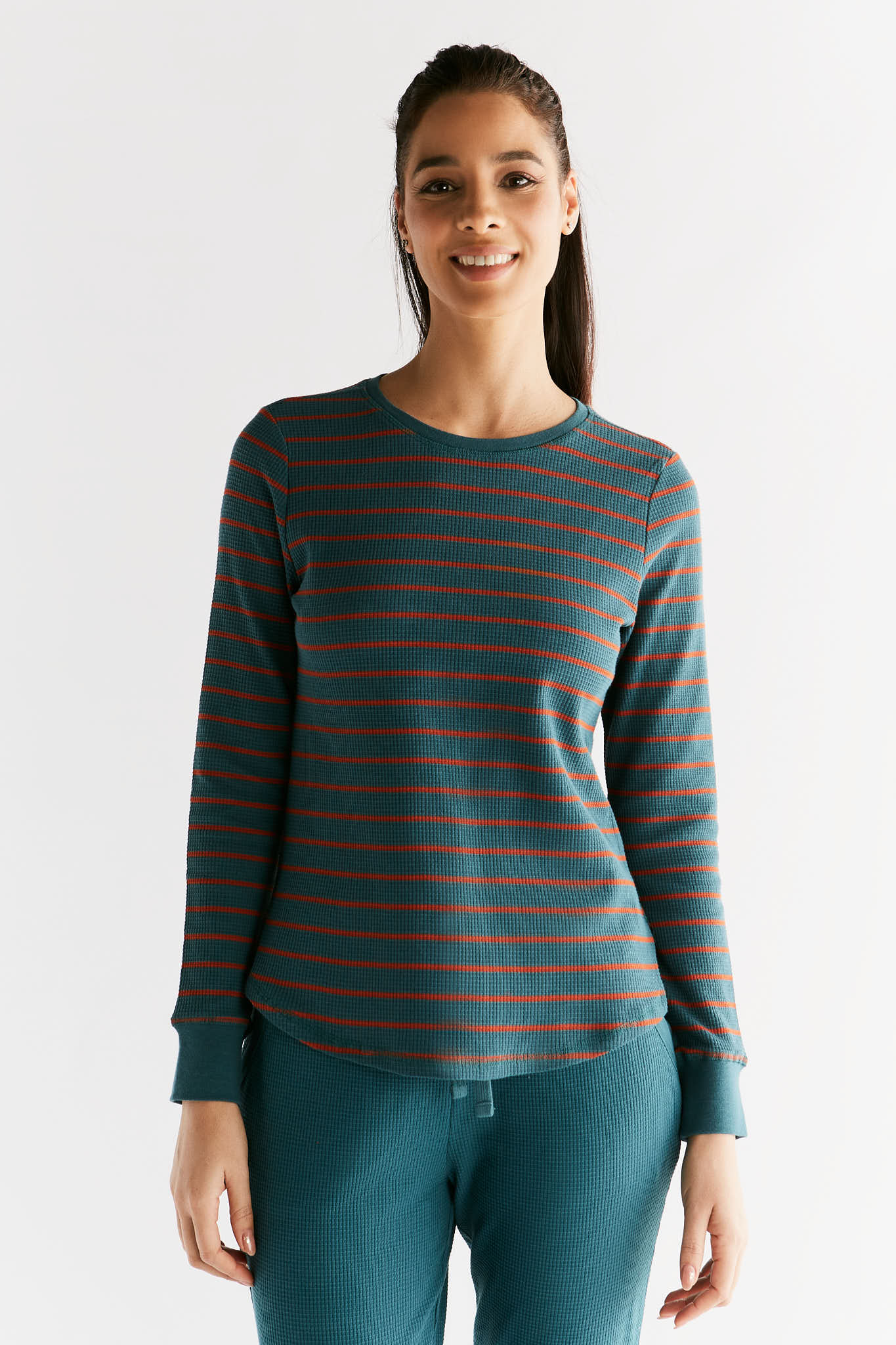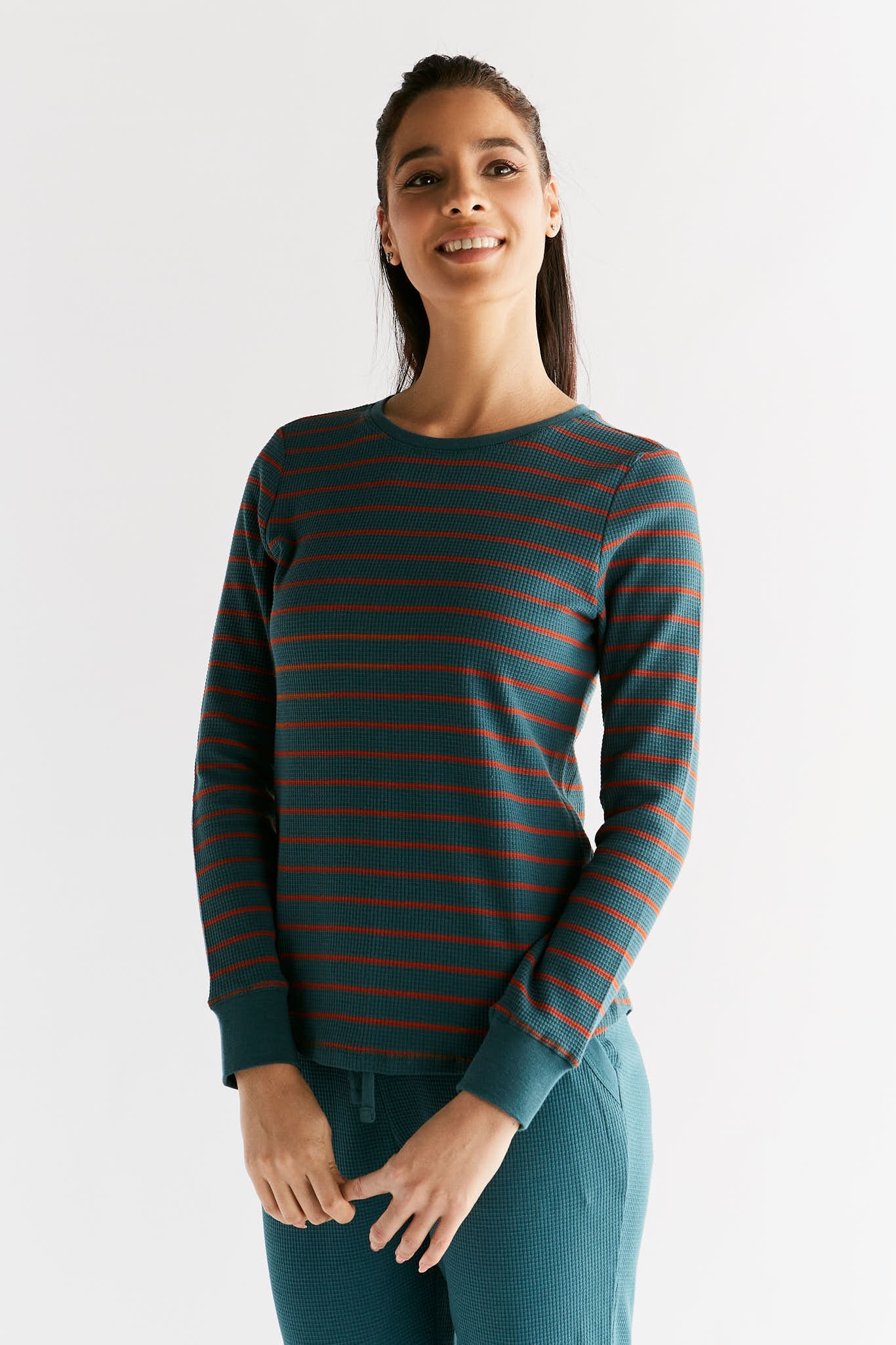 1252-051 | Waffel Strick Damen Langarmshirt - Tanne/Tabasco