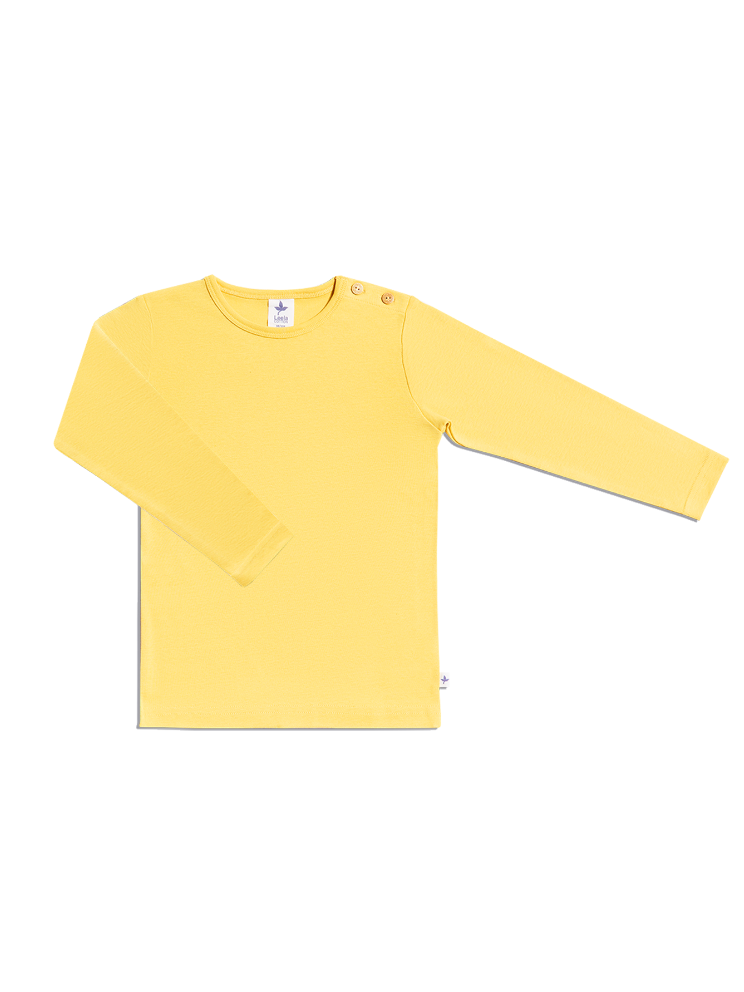 Hochwertiges Rippjersey Langarmshirt aus 100% Bio-Baumwolle (kbA) in einem freundlichem Ocker. Besonders atmungsaktiv, langlebig und angenehm zu tragen mit Holzknöpfen an der linken Schulter bei der Größe 98/104, zur Erleichterung des Ankleidens.