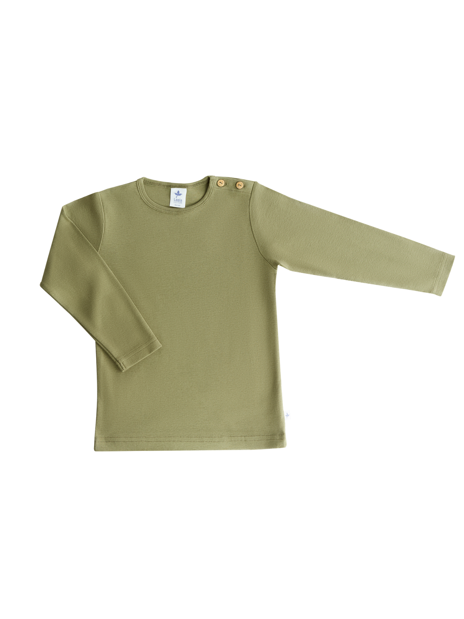 Hochwertiges Rippjersey Langarmshirt aus 100% Bio-Baumwolle (kbA) in einem natürlichen Olivgrün. Besonders atmungsaktiv, langlebig und angenehm zu tragen. Mit Holzknöpfen an der linken Schulter bei der Größe 98/104, zur Erleichterung des Ankleidens.
