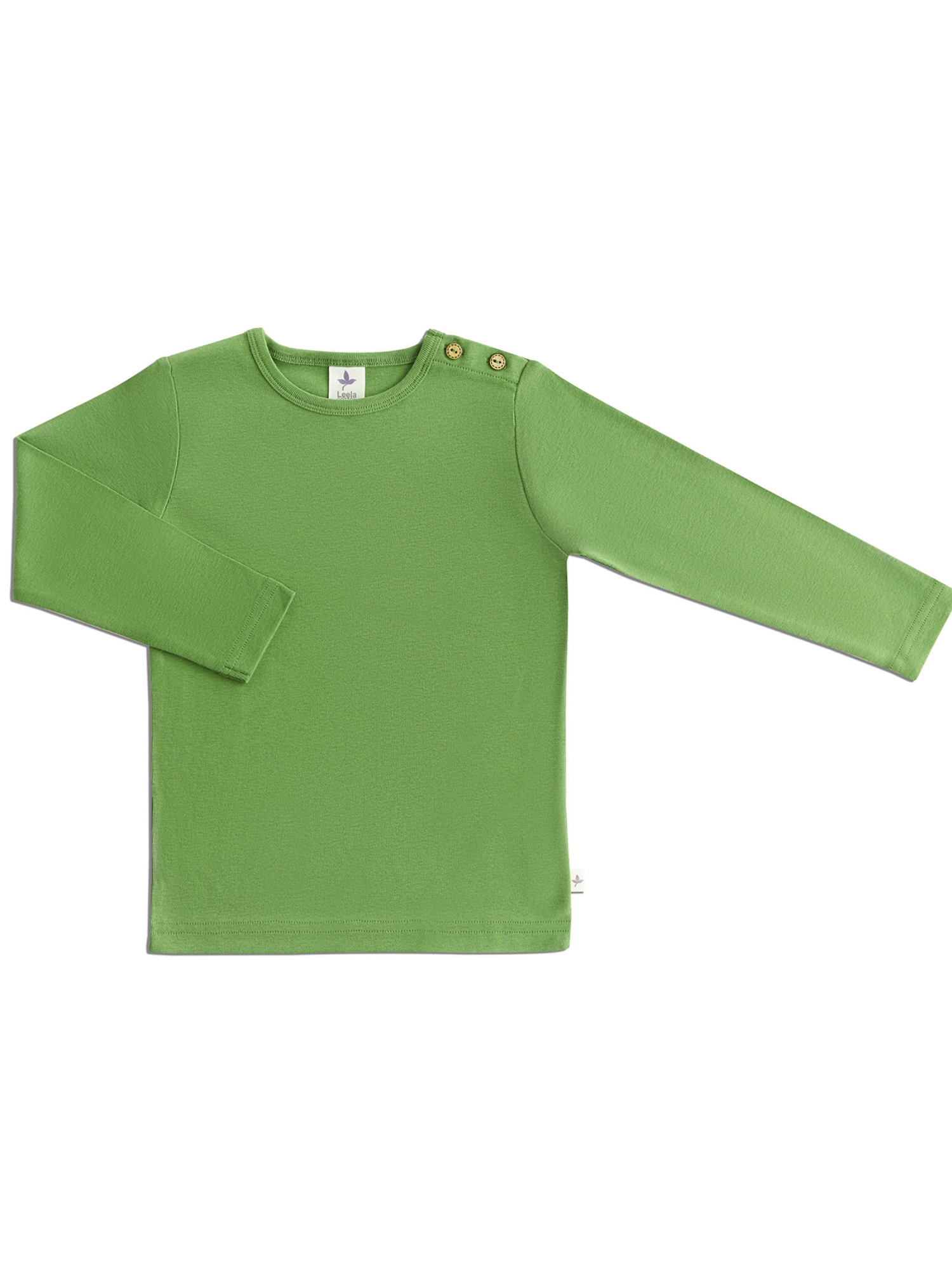 Hochwertiges Rippjersey Langarmshirt aus 100% Bio-Baumwolle (kbA) in einem vitalen Waldgrün. Besonders atmungsaktiv, langlebig und angenehm zu tragen. Mit Holzknöpfen an der linken Schulter bei der Größe 98/104, zur Erleichterung des Ankleidens.