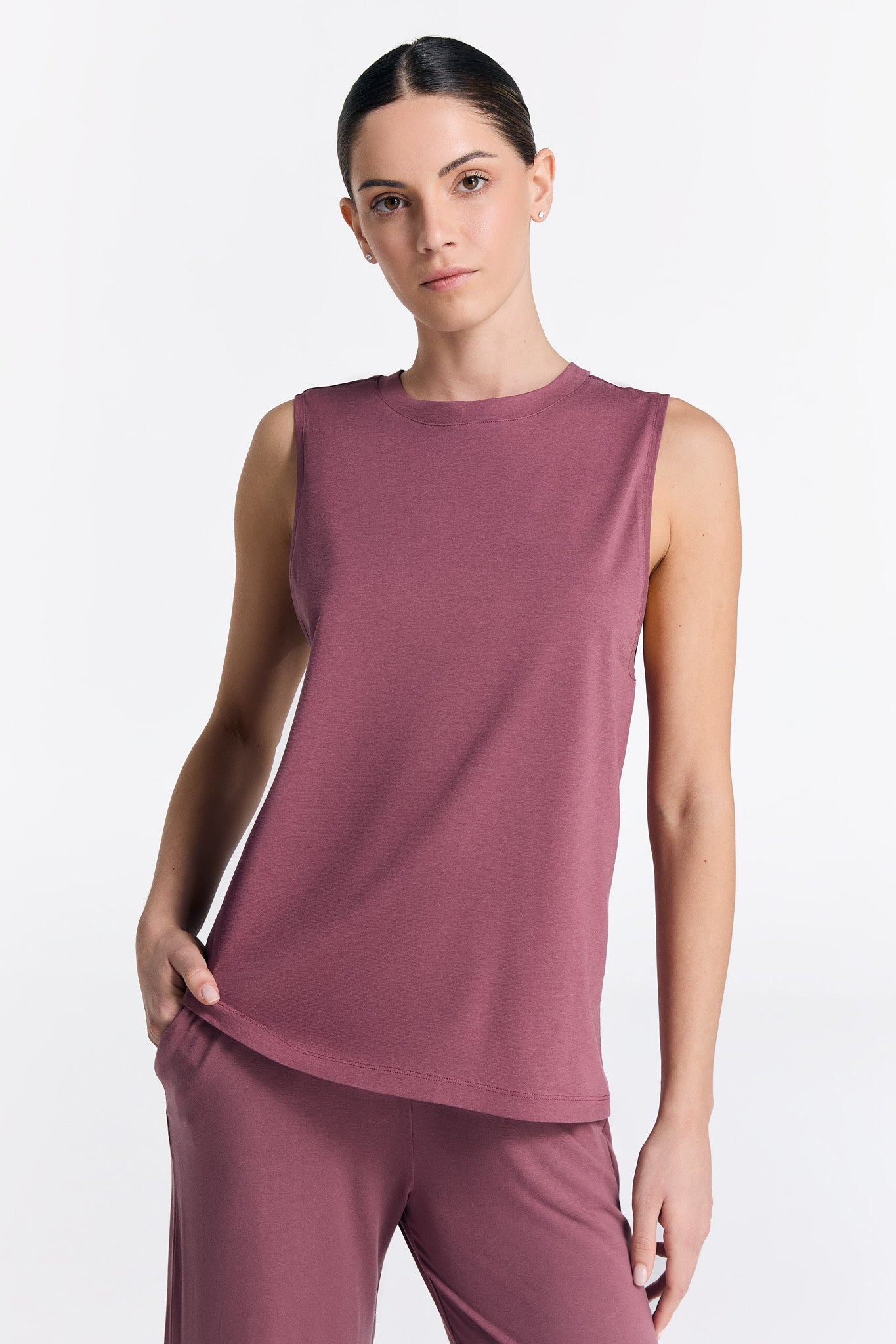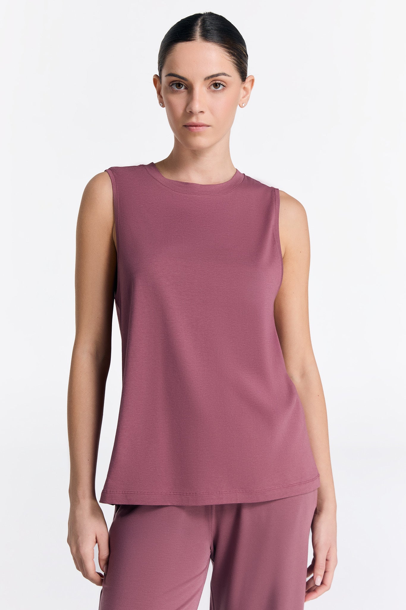 Hochwertiges Top aus 58% Bio-Baumwolle (kbA), 39% TENCEL™ Modal und 3% Elasthan. Die Bio-Baumwolle wird ohne schädliche Chemikalien angebaut und ist besonders hautfreundlich. TENCEL™ Modal, aus nachhaltig gewonnenem Buchenholz, sorgt für eine außergewöhnlich weiche und glatte Textur. Das locker geschnittene Top mit hohem Rundhalsausschnitt und weiten Armausschnitten bietet Bewegungsfreiheit und Komfort. Die weiche, elastische Baumwollmischung mit feuchtigkeitsregulierender Funktion ist optimal für sportliche Aktivitäten und ebenso gut für den Alltag geeignet.
