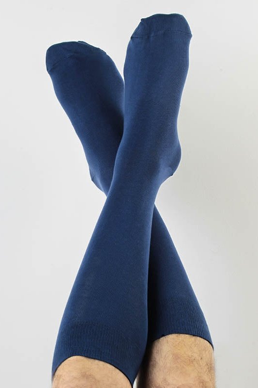 Hochwertig dunkelblaue Strümpfe in klassischer Strumpfhöhe aus 98% Bio-Baumwolle (kbA) und 2% Elasthan. Der bequeme Tragekomfort aus weichem Baumwolljersey wird abgerundet mit dem Elasthanfaden-Komfortbund.